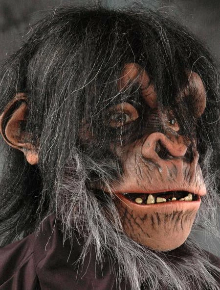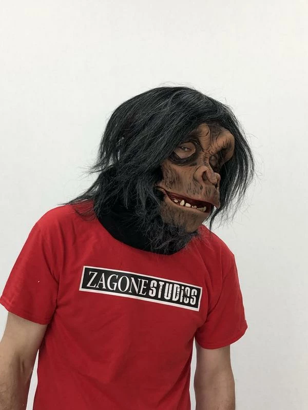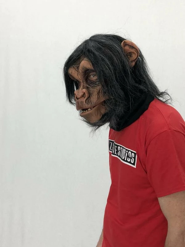 Full over-the-head latex mask with latex front and fur fabric head cover for cool, comfortable fit. Black fur with brown latex face. Matching shirt (1009BSS), gloves (1014BSG), and feet (1005BSF) sold only separately. Handmade mask with special details features moving mouth capability. The chimps mouth moves when your mouth moves! Mask openings: eyes, mouth. Has black stretch material so you can wear this mask comfortably! Breathable mesh material in mouth area, so all you see is the chimp’s mouth not yours! Care instructions: after use brush hair, stuff mask with clean dry newspaper, place in plastic bag and store in a cool dry place.