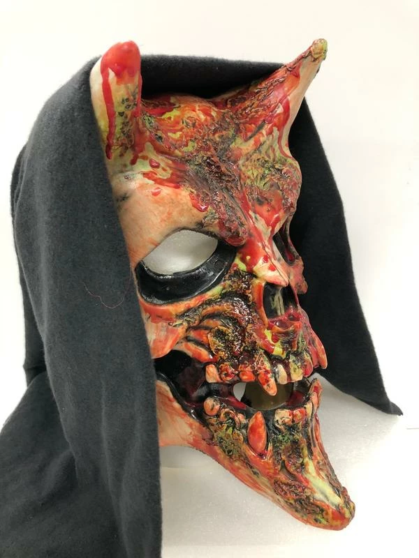 This satanic skull mask incorporates quality lined elastic strap for securement and a integral polyester hood. And green rotting skin, high gloss blood finish. Natural latex mask. Hand poured, painted and assembled in the US. Copyright BYBY. Devil Mask Adult Halloween Costume Haunted House Scary Evil Satin Demon Whispers.